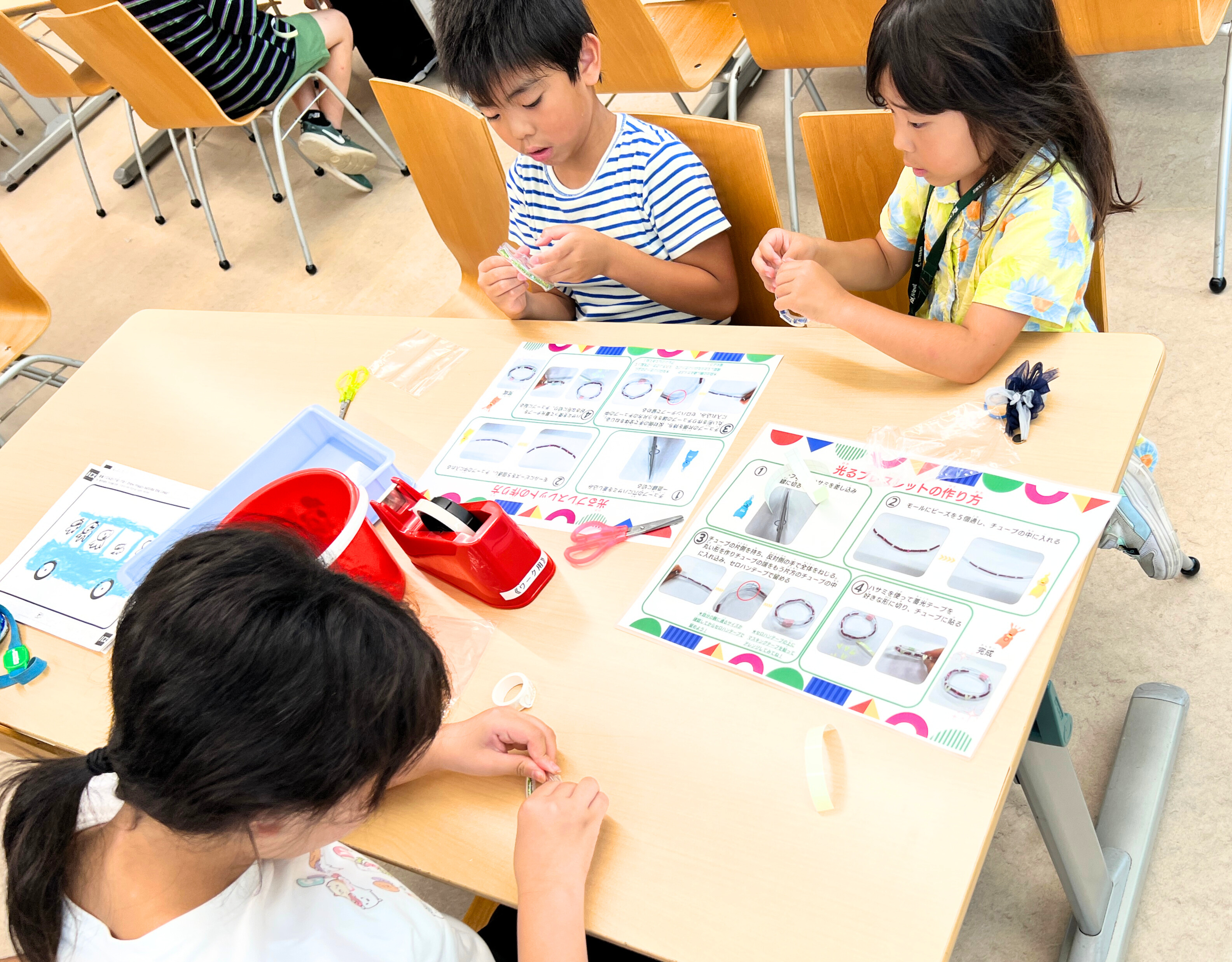 チューブにモールやビーズを入れて夏らしいオリジナルブレスレットをつくりました。蓄光テープが暗いところで光るのもキレイ!