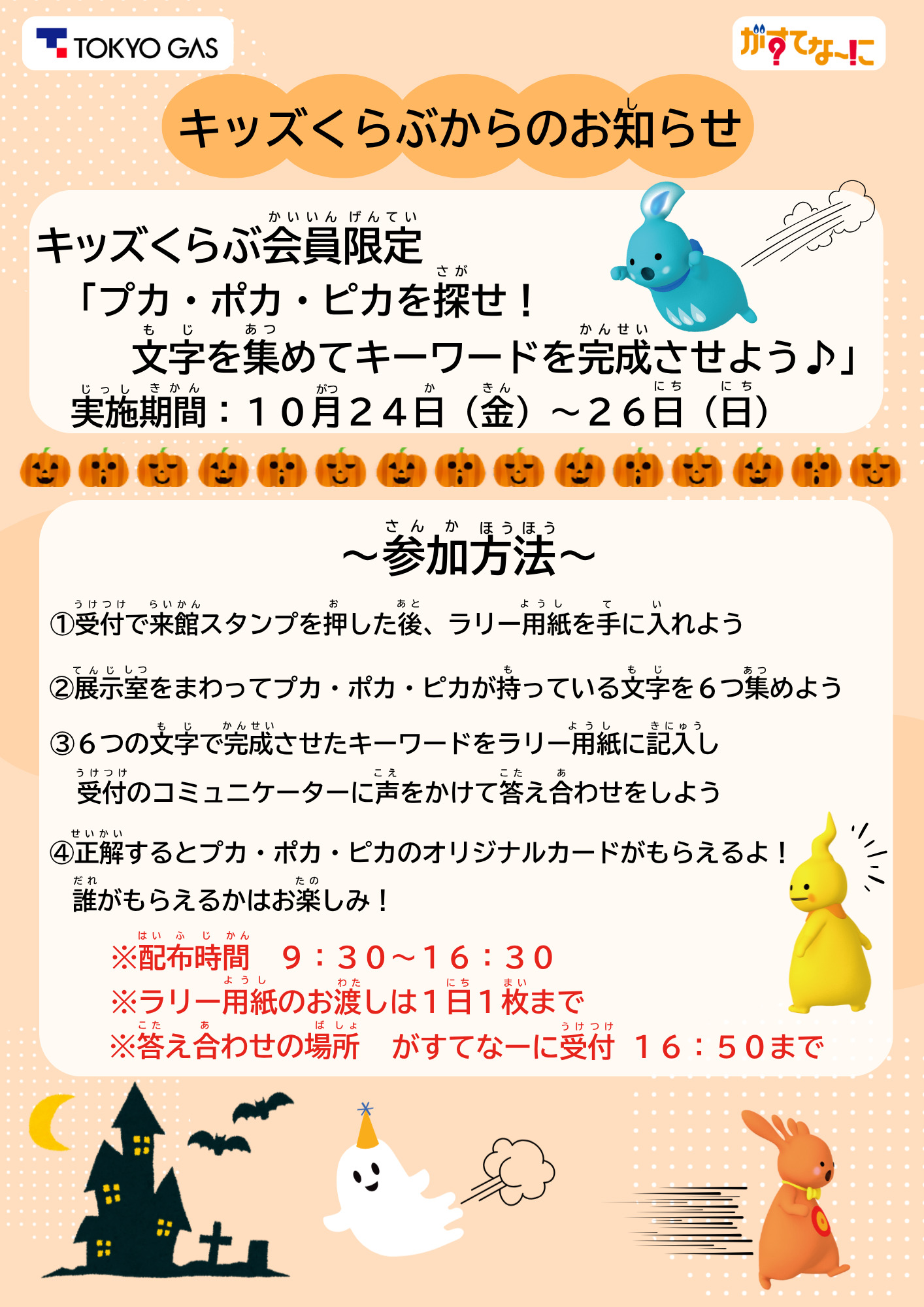 キッズくらぶ会員限定企画 「プカ・ポカ・ピカを探せ!文字を集めてキーワードを完成させよう♪」を実施します。