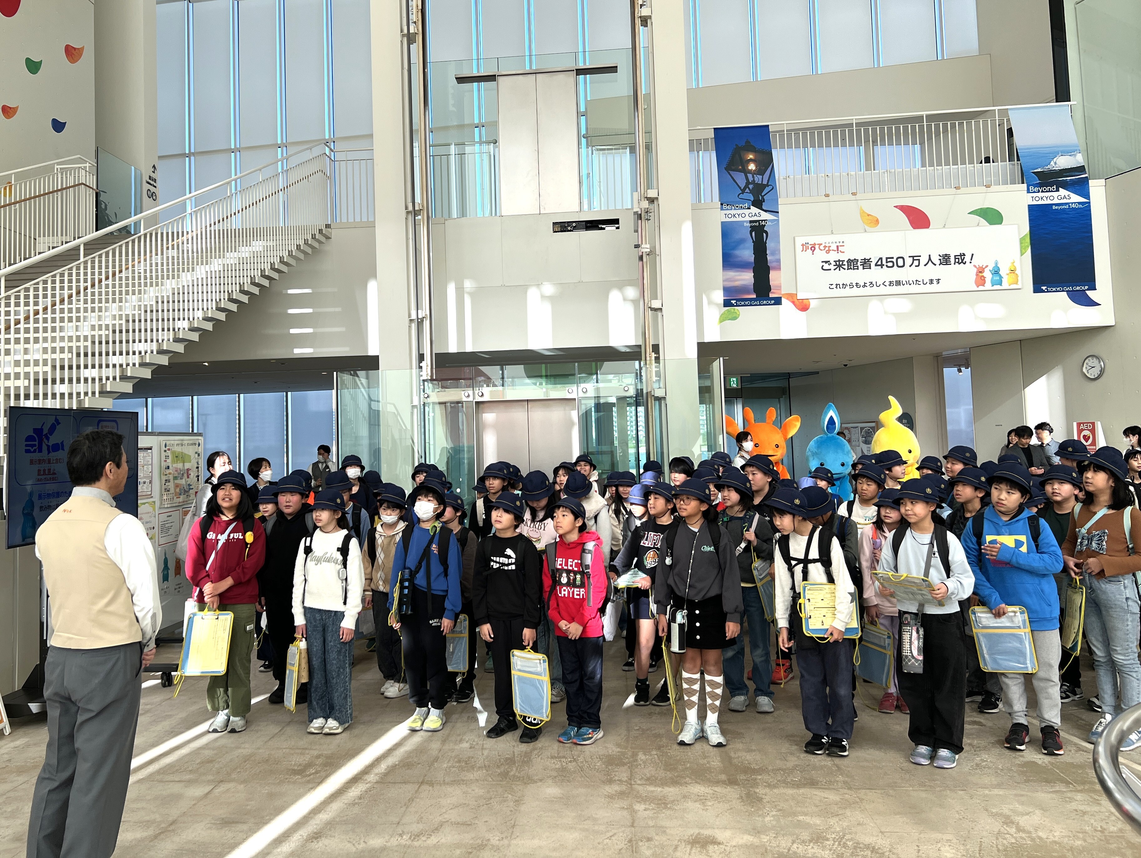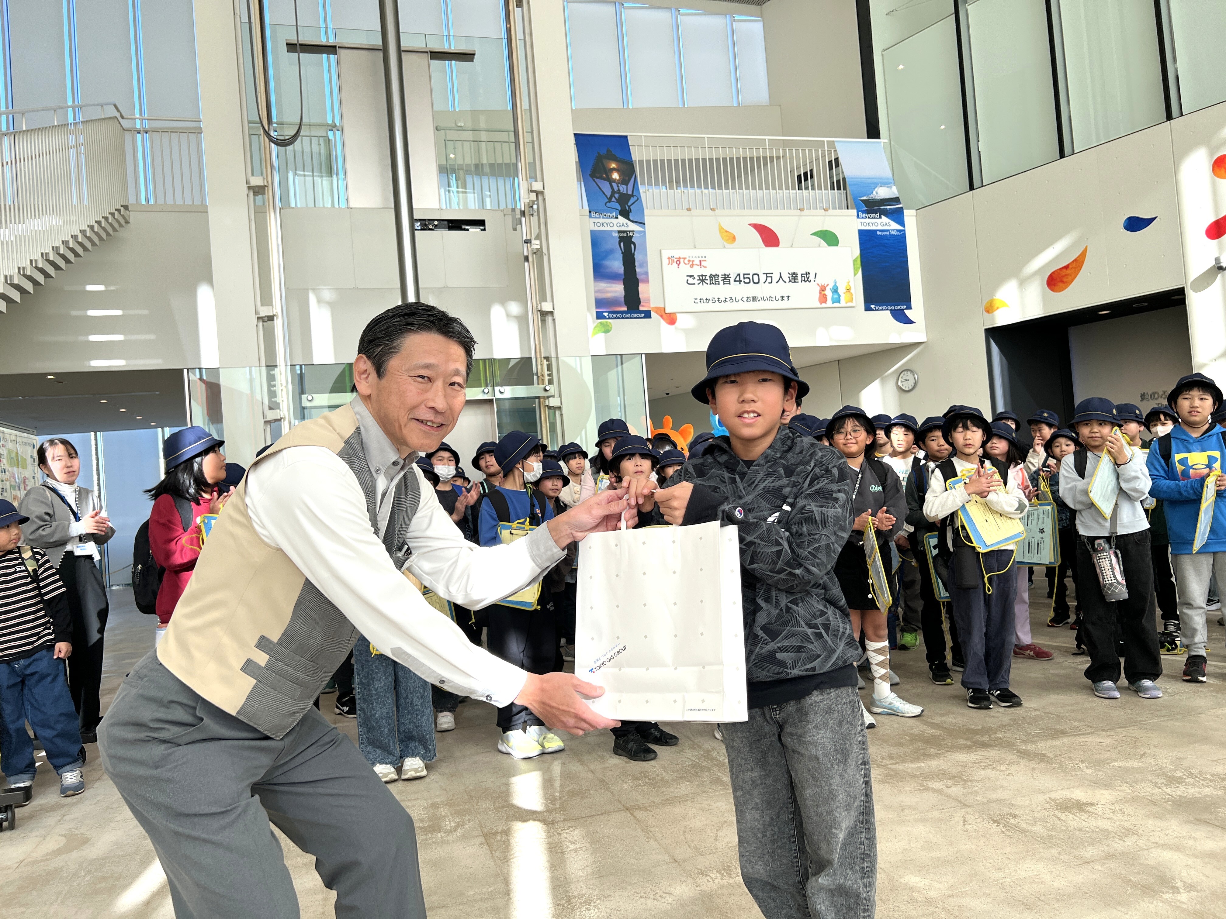 本日行われた記念セレモニーでは、450万人目の来館者となった東京都足立区立鹿浜第一小学校4年生の皆さんに、記念品を贈呈しました。