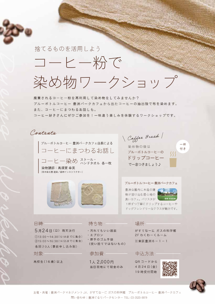 豊洲公園内の「ブルーボトルコーヒー豊洲パークカフェ」さまにご協力いただき、抽出後のコーヒー殻を使った優しい色合いの染め物と、コーヒーにまつわるお話を楽しむひとときです。